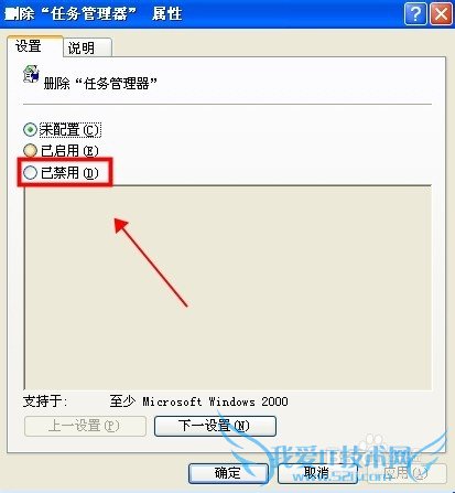 进入“删除任务管理器属性”界面之后,鼠标点选“已禁用”,然后点击确定,完成配置。