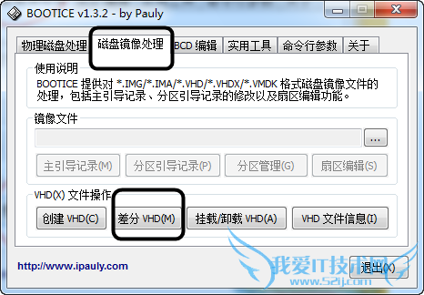 2.打开BOOTICE,在磁盘镜像处理标签下 ,点击差分VHD按钮