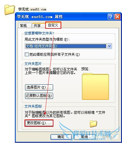 3、点击属性选项之后,在弹出的界面中,我们点击自定义按钮,然后将会出现自定义的对话框,在最下面我们将会看见设置文件夹图标的按钮,我们进行点击即可。如图所示: