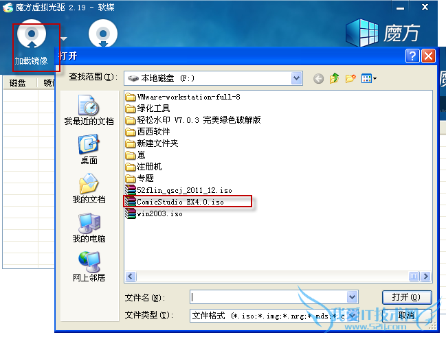 6、使用虚拟光驱加载镜像吧,加载镜像->打开镜像文件所在目录,选定ComicStudio EX4.0.iso镜像文件。使用西西制作好的镜像文件吧,上面5步帮你省略了。