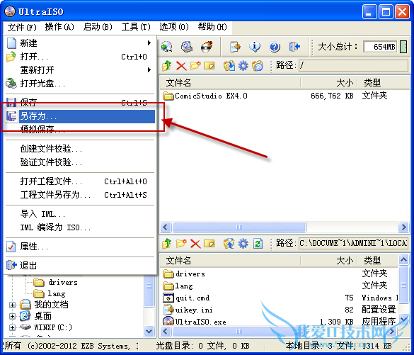 然后呢,又只有把解压的文件夹自己制作成iso镜像,使用的是UltraISO PE(软碟通),方法很简单,打开ULTRAISO.EXE后,把ComicStudio EX4.0整个文件夹拖入到UltraISO界面中即可,如下图。