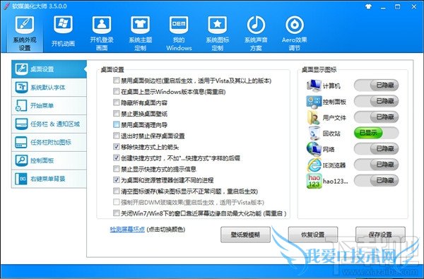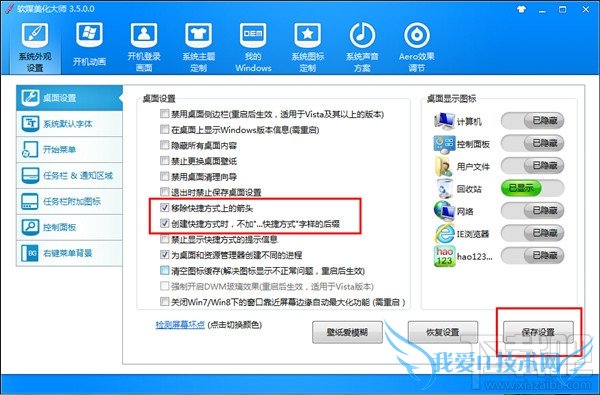 三、在美化大师的界面中的“系统外观设置”,把“移除快捷方式上的箭头”和“创建快捷方式,不加“...快捷方式”字样的后缀”,勾上,然后保存设置。
