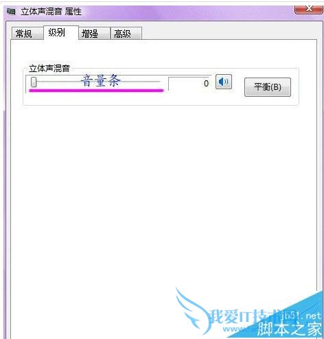 3、对混音选项进行调试,点击“立体声混音”,右键“属性”,或者是右下角的。出现“立体声混音”音量条,根据实际效果自行调节,点右下角的“确定”。再点到播放上,在扬声器上右键属性,点击级别,把里面的所有小红叉点消掉。