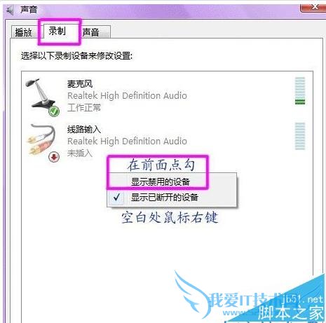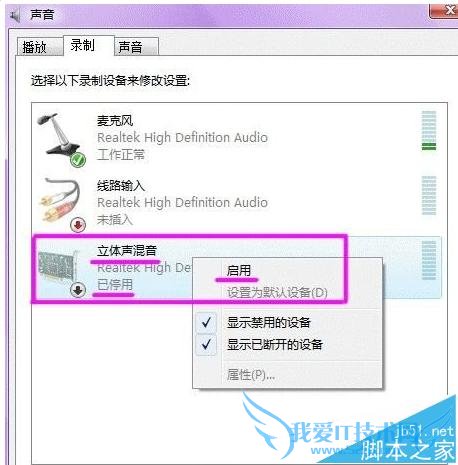2、对录制选项进行修改,选择“录制”,在中间的空白处点鼠标右键,勾选“显示禁用的设备”--“立体声混音”-启用