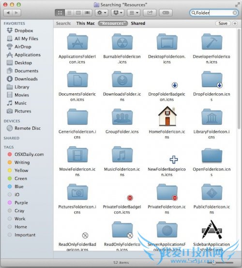 在目录中你将发现一大批 .icns文件. 他们就是原始的图标库并包含了不同尺寸的图标文件在内.像缺省的 Application , Documents,Desktop,Downloads,Developer,Group,Library,Music 等等一系列图标都在这.