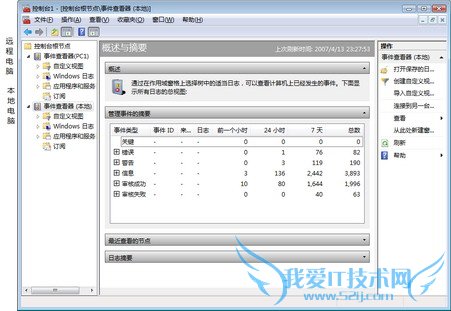 Vista的事件查看器窗口默认为三窗格模式,分别为树状结构区、事件显示区、操作区。对早已习惯Windows资源管理器或Outlook邮件阅读器的人来说,无疑是最友好的界面,给我们进行分类查询提供了方便(见图2)。