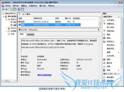 文中暗表:我曾尝试构建迷你版Office 2003并进行安装,安装过程中确实出过错,如图3所示正是在事件查看器中检测到的对这一错误的记录。由此可证实,事件查看器还真能洞查秋毫。