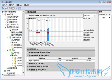 右击桌面上的“计算机”,选择“管理”,再在弹出的窗口中依次展开“计算机管理(本地)→系统工具→可靠性和性能→监视工具→可靠性监视器”即可打开它,如图7所示。它将影响计算机稳定性的因素分为五大部分,包括:软件安装(卸载)、应用程序故障、硬件故障、Windows故障、其它故障等。可靠性监视器最多可以保留一年的系统稳定性和可靠性事件的历史记录。这些记录以图表的形式显示。