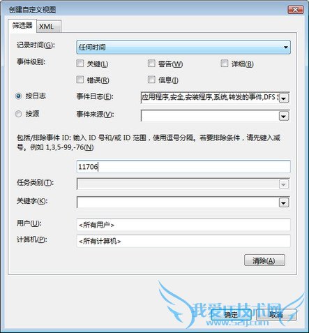 不仅如此,我们还可导出自己的记录或导入他人的记录,通过分享、会诊等措施来提高查询故障的准确率。本例中,我最关心的还是迷你版Office 2003的运行情况,那就将它收藏起来吧。单击“创建自定义视图”,弹出如图4所示对话框,由于这一事件已出现过,可选择“按日志”并在“事件日志”下勾选所有项目。再特别指明它的ID号,即11706。