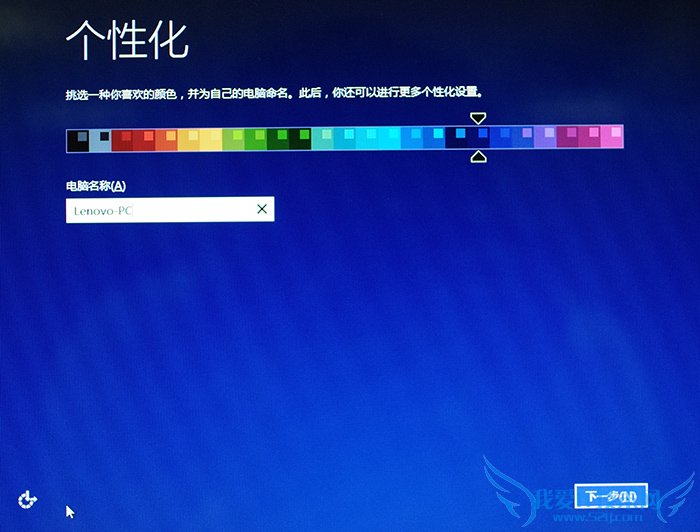 3. 在“个性化”设置界面,可以选择个人喜欢的主题颜色,其次可以输入电脑名称如默认的“Lenovo-PC”,确认无误后点击“下一步(N)”按钮。如下所示: