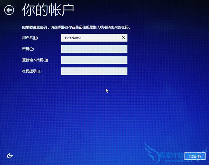 7. 在“你的帐户”界面,根据实际情况输入用户名,以及可选是否输入密码及密码提示,确认无误后点击“完成(F)”按钮。如下所示: