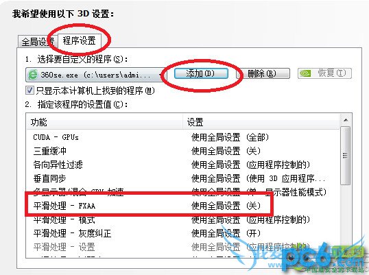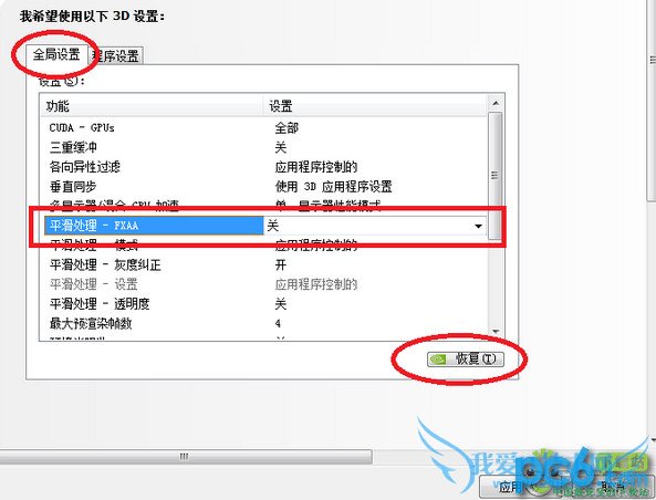 全局设置,看看FXAA是否开启,如开启请设置为关,如果什么都不懂,请直接点击恢复按钮,全部恢复成默认