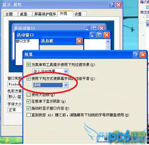 XP发生模糊这一问题的时候,按第一段就可以设置,WIN7发生这问题的时候,大概就是第三段的设置方法就能解决,第二段当然优先使用,看的顺序是图片在上,附带的文字说明在图片下面: