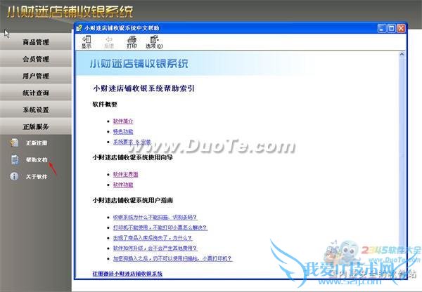 通过上面的介绍,你是否已经知道怎样才能学会超市收银?,如果认为不够详细,没关系,可以在打开小财迷店铺收银系统的“后台管理”的“正版服务”中点击“帮助文档”,在弹出的窗口中详细的介绍了怎样才能学会超市收银,保证一学便会。