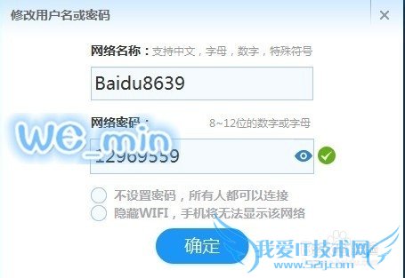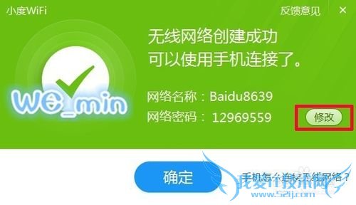 5、创建成功后会显示成功字样,还有wifi名称和密码。点击【修改】按钮,可以对名称密码进行修改。