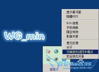 7、在电脑右下角,小度wifi图标上点击鼠标右键,选择【切换到无线网卡模式】后,小度wifi就变成了一个无线网卡,可以接收无线路由等设备释放的无线网络信号来进行上网。
