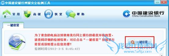 3、当您由于电脑设置和操作不当问题导致您不能正常使用网银时,您可以通过点击E路护航®安全检测工具中的“一键修复”按键将您的电脑和浏览器配置到网银运行的最优环境。如下图所示: