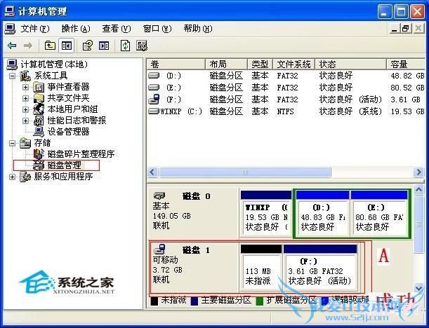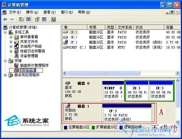 鼠标右键单击“我的电脑”,选择“管理”,在“计算机管理”窗口找到“磁盘管理”,点击它,在右侧窗口如果看到如下图所标“A"处,如果成功为两个分区,不成功或者没有制作为一个分区。
