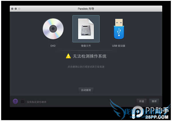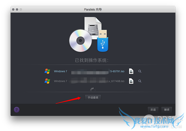 4、点击“手动查找”按钮,然后将win10的iso镜像文件拖动到parallels窗体中。它有可能无法识别win10,没关系,点击“继续”按钮。