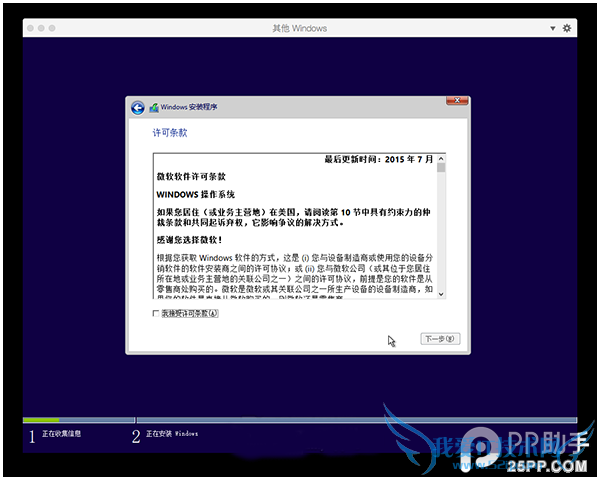 7、安装方法与实体机及其他虚拟机安装方式相同,基本上是下一步、下一步地点击。接受许可条款,然后点击“下一步”按钮,接下来按照提示安装即可。