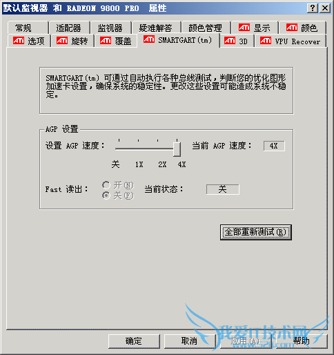 SmartGart是ATi配合Catalyst(催化剂)驱动发布的一款显卡小工具,通过自动执行PCI/AGP总线测试,判断用户的显卡设 置是否正常,以确保系统的稳定性。滑动“设置AGP速度”滑钮可对AGP的速度进行调整,你可以直接通过这里设置AGP速度,但如果ATi的 SmartGart认为当前的设定并不正确,其将会自动更改你的设定。在下面的Fast Write(快写)项中可开启或关闭Fast快写功能,快写功能可让CPU不通过内存就直接把数据发送到显卡,以加快显卡的速度,多数测试结果说明这种模 式对显卡性能提高是较有效的,但某些系统在开启此功能后也可能会导致性能下降。此外,如果你的系统已存在不稳定因素,则可关闭Fast Write试试。