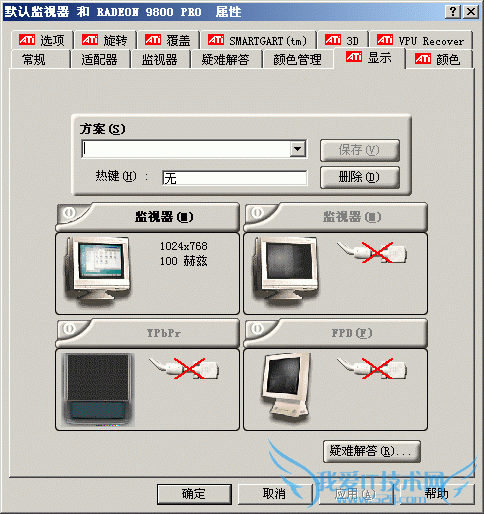 “ATi显示”选项可对单显示器及多显示设备进行屏幕位置、屏幕大小调整,其也可对显示器的当前屏幕分辨率和刷新率信息进行调整(图4)。若你 安装了第二个显示设备或电视机,单击设备的①按钮也能启用和禁用这些显示设备。 例如,你只需用一根AV线或S端子线从显卡视频输出接口连接电视机的相应输入接口,就可在大屏幕电视上观看DVD影片或玩游戏。而选中“TV”按钮,可对 电视屏幕进行清晰度调整和视频制式的选择等,以使你的显卡视频输出效果最佳。如果你的显卡和显示器都支持色差输入输出这种高清晰显示方式,并有相应的连接 线,我们也可以在这里这里选中YPbPr,使用色差输出方式,体验更高的电视输出效果。