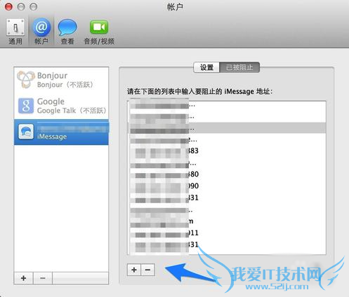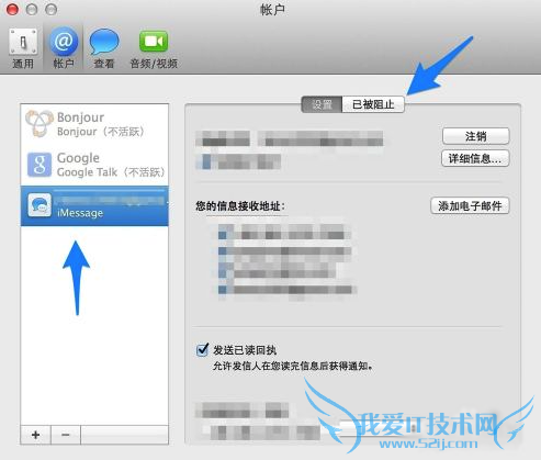 4、随后在左窗格中选中自己的 iMessage 帐户,再点击右边的“已阻止”选项卡,如图所示