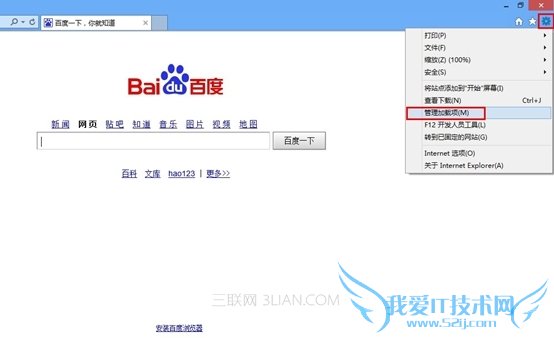 1. 进入IE浏览器,打开右上角工具(是个小齿轮的标记,如图)----管理加载项;