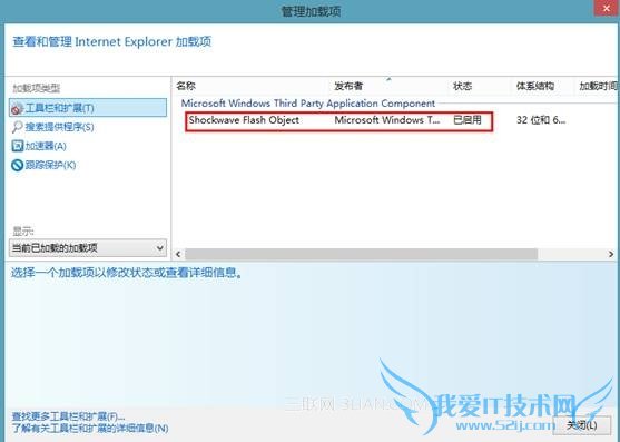 2. 观察IE 10中Shockwave flashObject的加载项是否被禁用,如果禁用请启动该加载项;