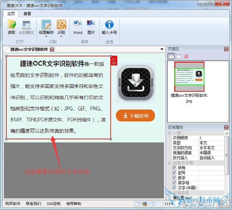 2、在软件打开的文件中,用鼠标圈定需要提取的文字内容。