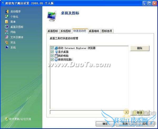 许多软件为了方便用户使用,在安装程序后都会在任务栏的快速启动栏加入其快捷方式,但时间一长,快捷方式会越来越多,调用起来反而更加不方便,并且系统没有提供批量删除的功能,只能逐一将它们删除。这时,你可以打开超级兔子魔法设置,选择“桌面和图标”选项,然后切换到“快速启动栏”选项卡,然后在列表中将快捷方式前面的勾取消。如果你想将它们彻底删除,选中后单击“删除”按钮就可以了。