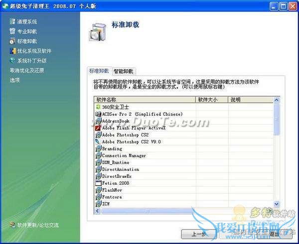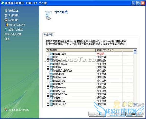 清理王:优化系统、清除垃圾。轻轻松松优化系统,清除硬盘与注册表的垃圾,卸载各种顽固软件和IE插件,其中专业卸载可以完美卸载常见的广告软件和其它软件。
