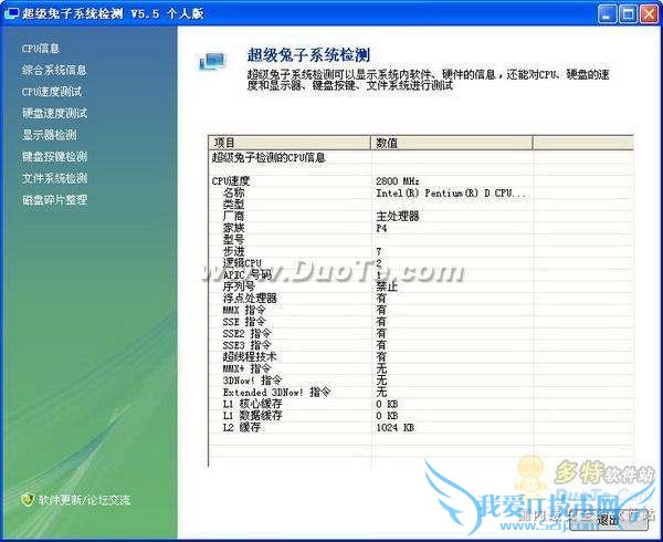 超级兔子系统检测可以显示系统内软件、硬件的信息,还能对CPU、显卡的速度和键盘按键进行测试。