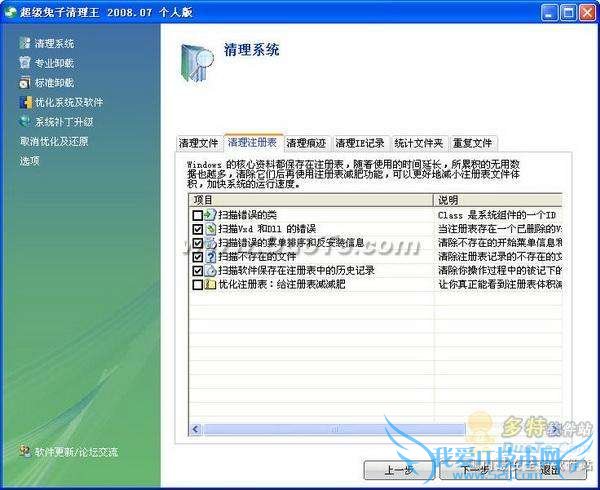 4、超级兔子清理王的每个优化项目、每一个操作步骤均有详细的解释和优化作用介绍,让不懂电脑的用户也能轻松知道软件做了什么优化,采用精灵向导操作方式,一步一步轻松完成所有优化工作。