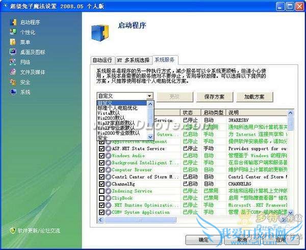 进入超级兔子魔法设置的“启动程序”,在列表中可以看到所有开机时运行的程序,选中某个程序后便会显示其所在目录和启动参数,接着将一些不必要的启动程序前面的勾去掉,就可以禁止其开机时自动运行了。另外,系统服务也会影响机子的启动速度,但那些服务项目才是可以禁用的呢?只要单击“系统服务”选项卡,然后在优化方案下拉列表中选择“标准个人电脑优化方案”,软件就会帮你设置,现在重新启动系统看看,效果还不错吧?另外,在魔法设置中还有许多和系统相关的选项,如:隐藏收藏夹、打造个性化右键菜单等,这些留待大家去发掘了。