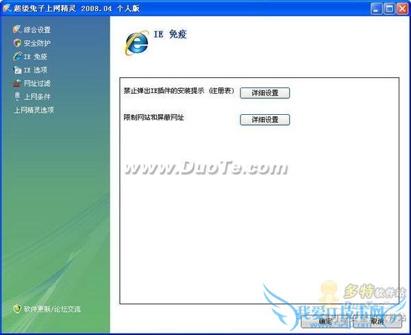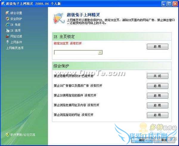 上网精灵:保护IE、清除广告和色情。可以禁止IE广告、保护IE不被恶意网站修改,还有禁止色情网站,上网时间控制等一系列强大的IE控制功能。