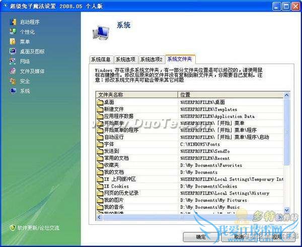 提示:对于“应用程序数据”、“Windows文件夹”等项目,不建议修改其默认目录,如果修改后出现问题,可以右击它选择“复原”即可恢复原来设置。