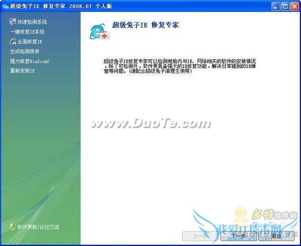 IE修复专家:修复IE、检测木马。采用自动及人工等多种方式解决IE被非法网站修改的问题,其中人工服务只供正版注册用户使用。