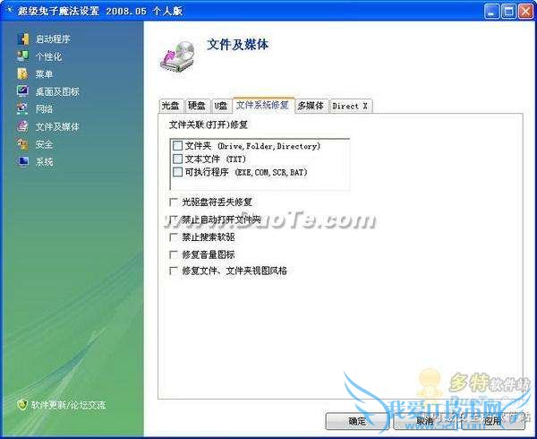 一些木马会破坏系统的.exe执行程序文件关联方式,这样用户将会无法运行所有.exe的文件,以阻止杀毒软件的查杀。修复方法:打开超级兔子的安装目录,找到srms.exe,改名为srms.com。双击后便可以运行,接着在“文件及媒体”选项中选择“文件系统修复”选项卡,勾选“可执行程序”项目,单击“应用”按钮,便可以修复文件关联(记得之后将魔法设置重新改为srms.exe)。最后再使用杀毒软件对系统进行检测即可。