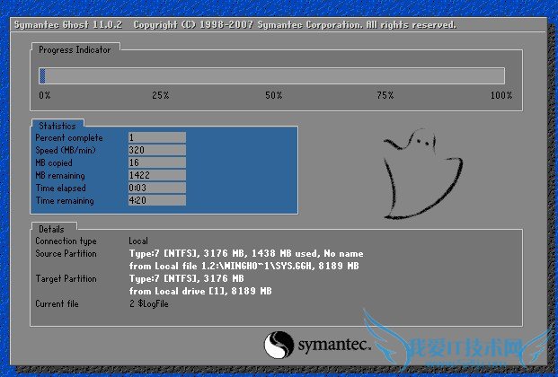 重新启动电脑后就进入一键还原开始使用上一次的备份文件 SYS.GGH 进行系统还原了。完成到100%后就会重新启动进入到你备份的操作系统。