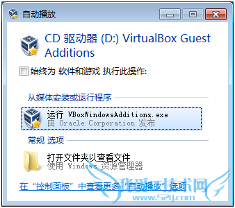 出现“自动播放“对话框,点击”运行VBoxWindowsAdditions.exe”安装增强功能。(如果没有出现“自动播放”对话框,可以在“计算机“中打开虚拟光驱,找到VBoxWindowsAdditions.exe,双击进行安装)