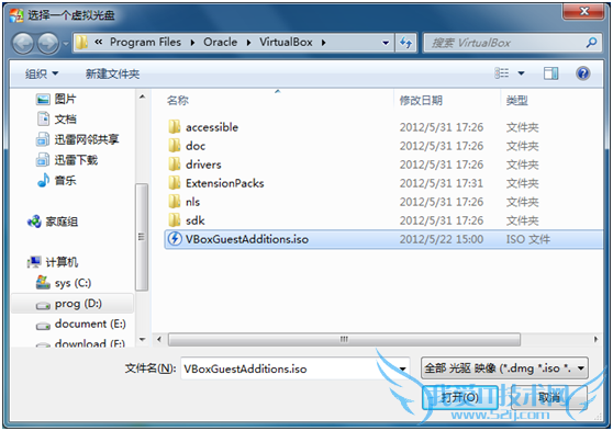 找到VirtualBox安装目录,选择VBoxGuestAdditions.iso,点击“打开“