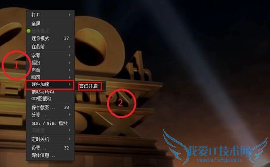 1. 打开迅雷看看并打开需要播放的高清影片后,直接在影片播放窗口内按下鼠标右键,在弹出的菜单中选择“硬件加速”后,在弹出的菜单中选择“尝试开启”,如下图:
