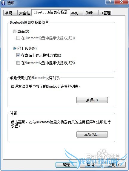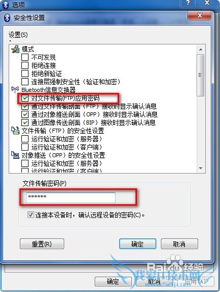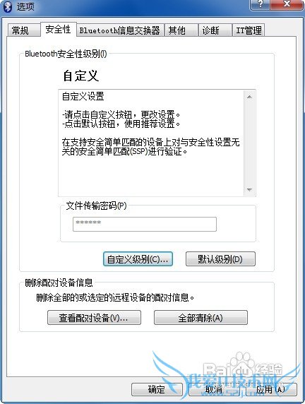 进入蓝牙程序的设置窗口后,点击安全性选项卡,如图设置。