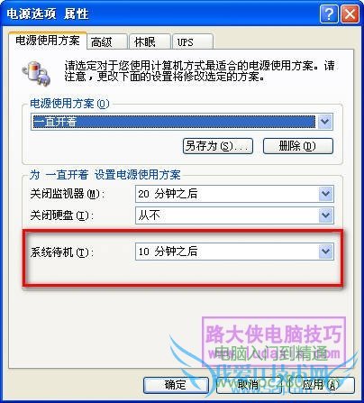 在屏幕保护程序标签页的下方,点击“电源”按钮,进入电源管理窗口,最下方“系统待机”一项,选择“10分钟以后”,就可以了,如下图: 转自电脑实用百科 www.pc280.com