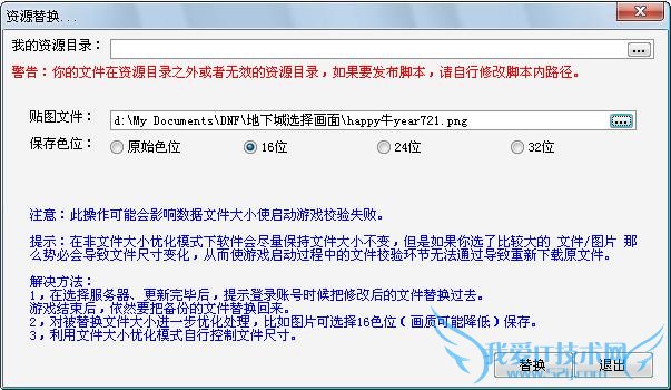 在贴图文件选好你所想要用来替换的图片,然后点击替换。保存色位自己决定,不过还是推荐选择16色位,因为这样的话可以减小图片的大小,而且对图片的影响也不会很大(至少我的图都没事),至于我的资源目录我也不知道干嘛用的,不用管。