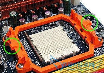 如图所示,两边各有一个可以往下压的铁条,中间是一根弹簧钢条连接。原理就是两边的铁条下压,铁条下方的方口挂到CPU底座的的挂钩上,从而两根铁条和中间的弹簧钢条一起把散热装置固定在CPU底座上。拆除时就应该先按着一边的铁条,使其脱离CPU底座的挂钩,然后像向风扇方向推,使其彻底脱离挂钩,一边拆除之后,另外一边自然就挂不住了