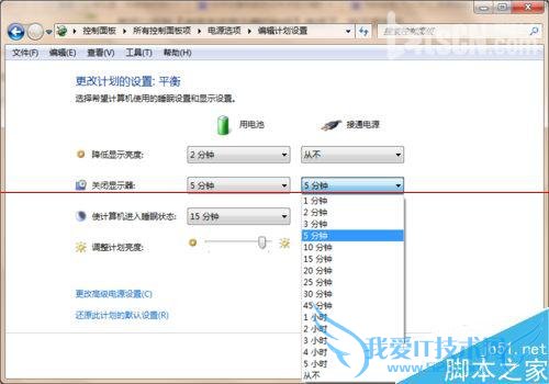 5、点击【选择关闭显示器的时间】选项,进入编辑计划设置界面,在该界面可以看到关闭显示器选项了,笔记本电脑有用电池和接通电源两种方式,如下图所示。