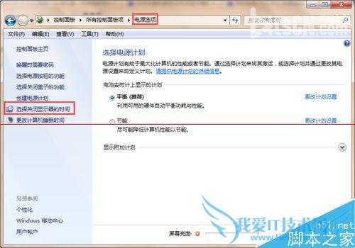 4、点击【调整亮度】选项,进入控制面板电源选项界面,在该界面的左侧菜单栏里就可以找到【选择关闭显示器的时间】选项了,如下图所示。