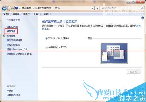 3、点击【显示】选项,进入控制面板显示界面,在左侧菜单栏里可以找的【调整亮度】选项,如下图所示。